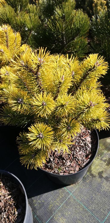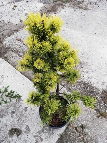 En långsamväxande dvärgform av tall. Den har korta, täta, mörkgröna barr. Den är motståndskraftig mot kyla, vind, torka och har inga speciella jordkrav, så den är mycket lämplig för balkonger, terrasser och krukor. Den är också mycket lämplig för stenpartier. På vintern blir barren gyllenbruna. I vuxen ålder, efter cirka 10 års tillväxt, växer den till en höjd och bredd på cirka 0,5 till 1,5 meter, beroende på jordförhållanden och plats i trädgården.