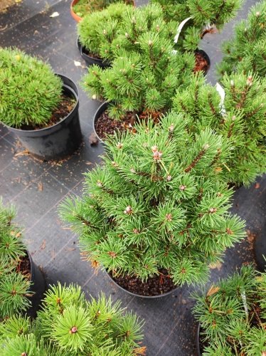 En populär tall bland samlare och bonsai-entusiaster. Barren är 5-6 cm långa, växer i buntar om fem och är mörkgröna med en slående blå, grön och silverfärgad beläggning. När nya barr växer i grenarnas ändar faller de äldre mot stammen, vilket är naturligt för denna tall. Höjden i vuxen ålder (50 år) är cirka 3 m. Den bildar en tät, låg buske. Frostbeständig till -34 °C.